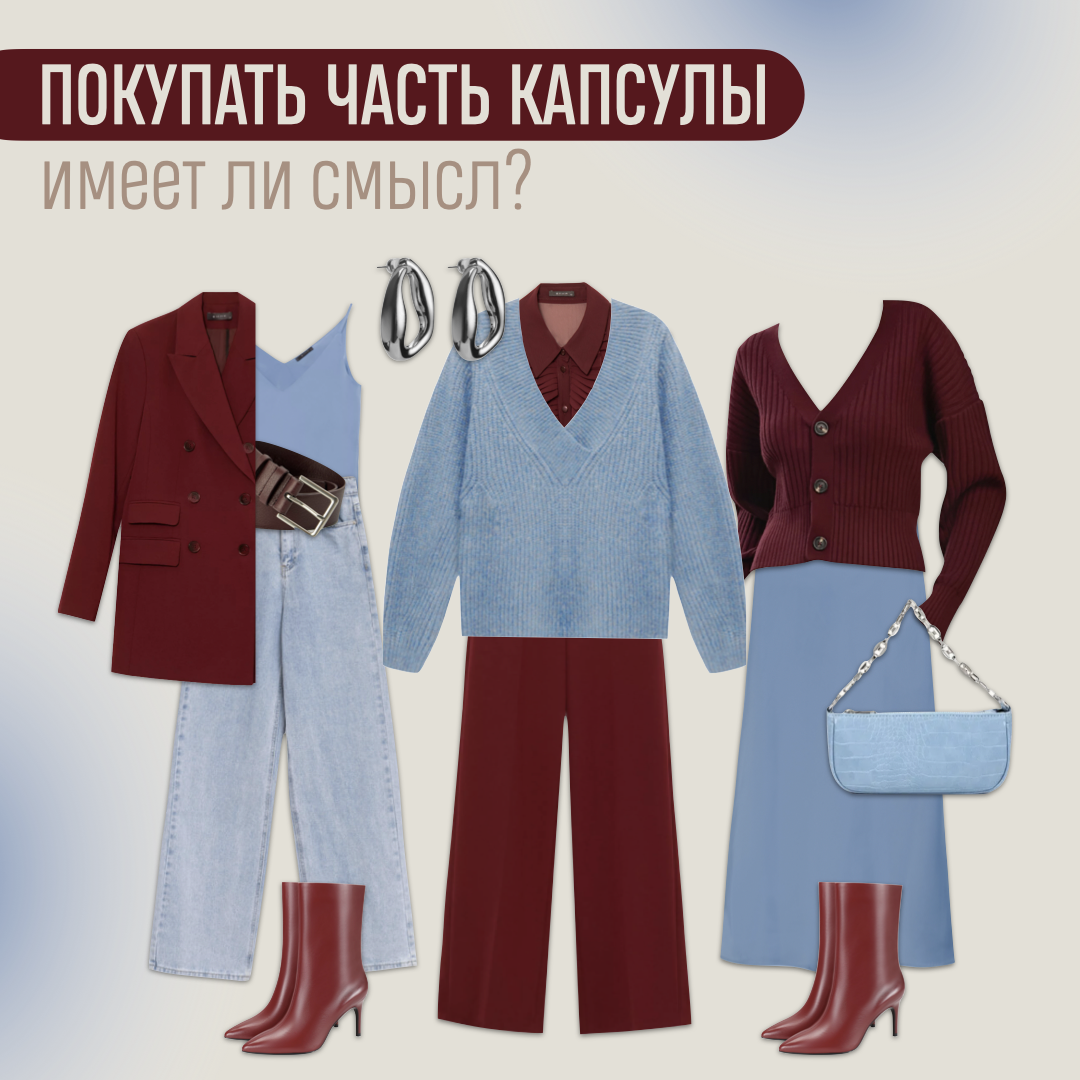 💯Здесь не действует принцип «Все или ничего». В капсуле могут быть две пары брюк и юбка: если что-то не село или не нравится, некритично – есть, чем заменить.