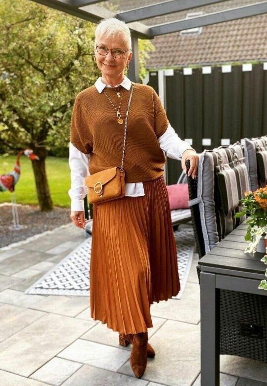 - Простой, но при этом эффектный образ с плиссированной юбкой. Юбка длины миди красивого карамельного оттенка надета в комплекте с белой рубашкой, которая заправлена за пояс лишь частично, одна пола оставлена навыпуск. Поверх рубашки надета коричневая безрукавка. Образ дополняют сапоги из коричневой замши, а также желто-коричневая сумка.
