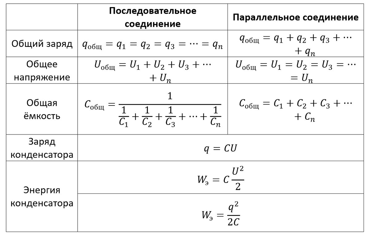 - формулы для определения эквивалентной емкости конденсаторов, соединенных последовательно и параллельно;