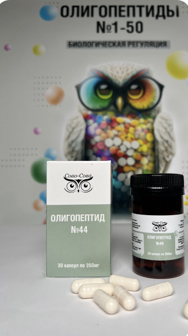 Пептиды комплекса №44 выравнивают соотношение активности системы «коллагенообразование – коллагенолизис» путем воздействия на поврежденные звенья функциональной системы коллагенообразования и функциональной системы, ответственной за деградацию или лизис коллагена, нейрогормональные системы регуляции обмена коллагена и устранение нарушений обеспечения функциональных систем.