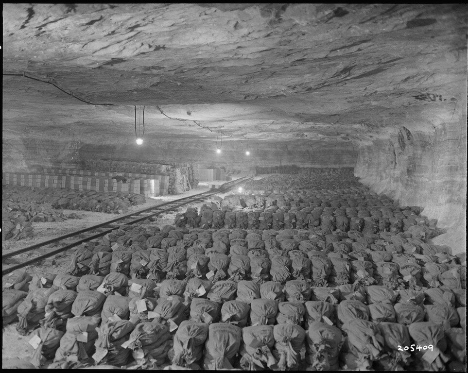 ✔Хранилище в соляной шахте, где нацисты прятали золото Рейхсбанка, награбленное СС. Здесь также содержались картины Берлинского музея. Было обнаружено 3-й армией США в апреле 1945 года. В хранилище содержалось 3682 мешка и коробок с немецкой валютой, 80 мешков иностранной валюты, 4173 мешка с 8307 золотыми слитками, 55 коробок с золотыми слитками, 3326 мешков с золотыми монетами, 63 мешка с серебром, 1 мешок с платиновыми слитками, 8 мешков с золотыми кольцами и 207 мешков и контейнеров с награбленным СС антиквариатом.