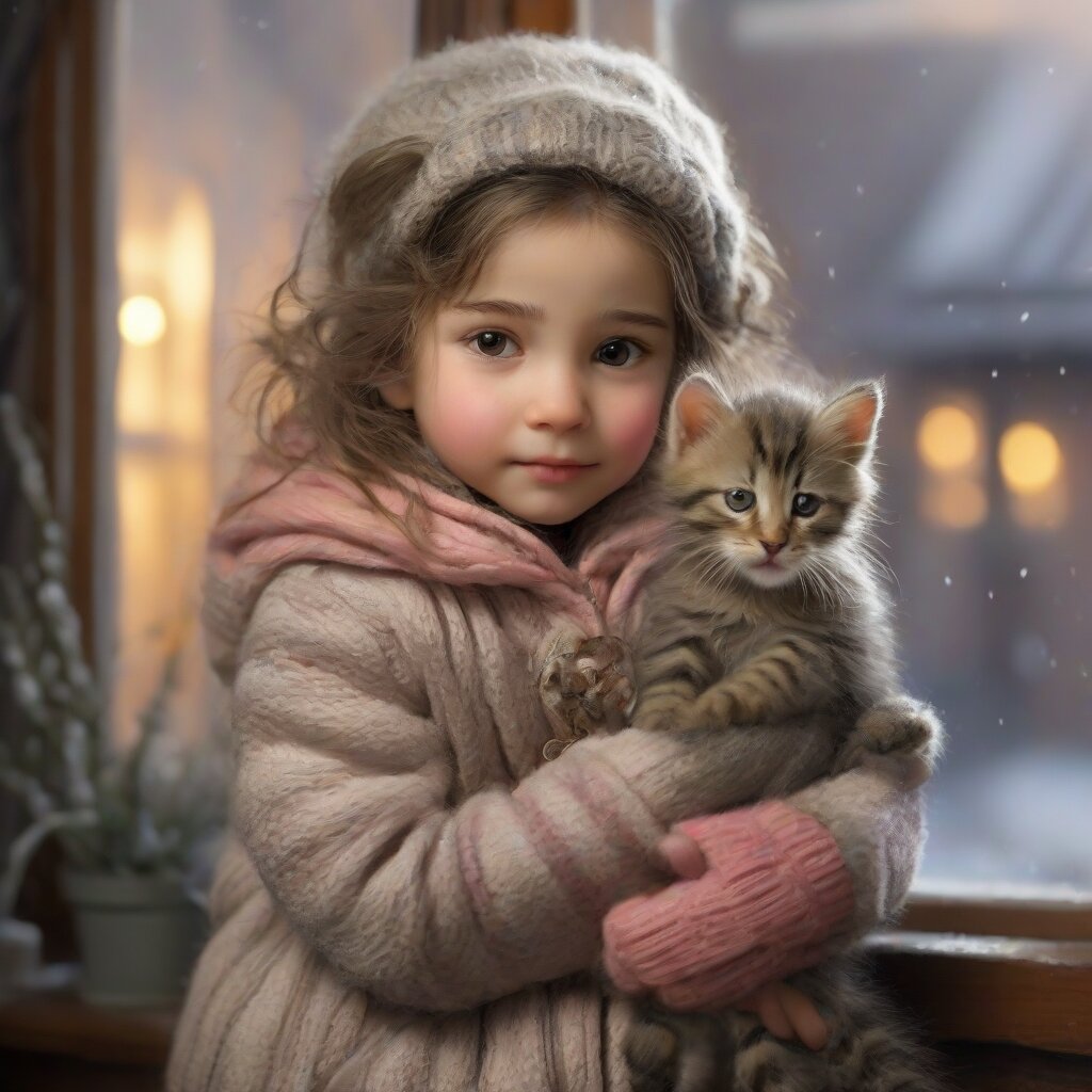 Зимнее солнце едва пробивалось сквозь серые тучи. Маленькая Соня шла по улице и грустно вздыхала, глядя по сторонам. Девочка мёрзла без тёплой шапки и варежек, но она отдала их бездомной собаке Мухте, которую всегда подкармливала. Вдруг Соня услышала тихое жалобное мяуканье из-под забора. Заглянув в щель, она увидела совсем крохотного полосатого котёнка. Бедняжка дрожал от холода и был очень слаб. Дома она напоила голодного котёнка молоком, согрела у батареи и постелила в коробку из-под обуви. Когда мама Сони вернулась с работы и увидела котёнка, она нахмурилась: Котёнок жалобно мяукнул и посмотрел на маму умоляющими глазами. Мама вздохнула: Котёнок громко замурлыкал, умываясь лапкой. Кажется, теперь у него появился настоящий дом! И это всё благодаря доброй девочке Соне, которая не смогла пройти мимо беды.