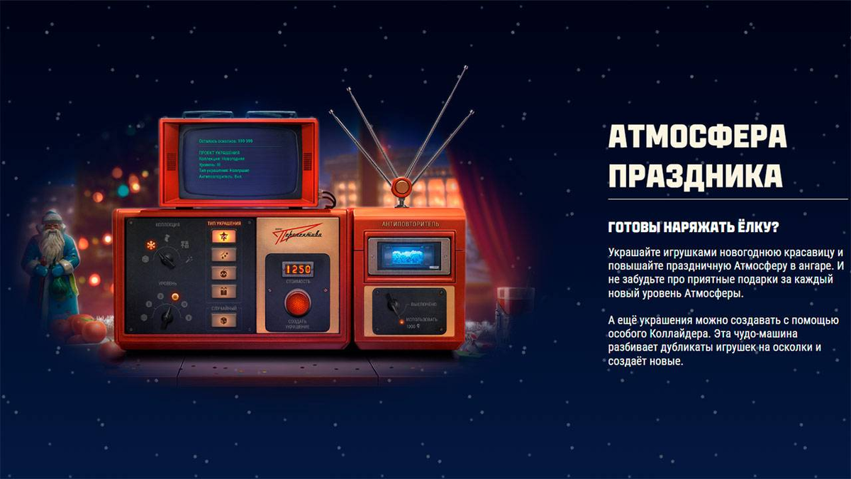 Наряжая ёлку в праздничном ангаре можно будет повышать уровень праздничной Атмосферы для получения подарков. А специальный Коллайдер преобразует лишние игрушки.