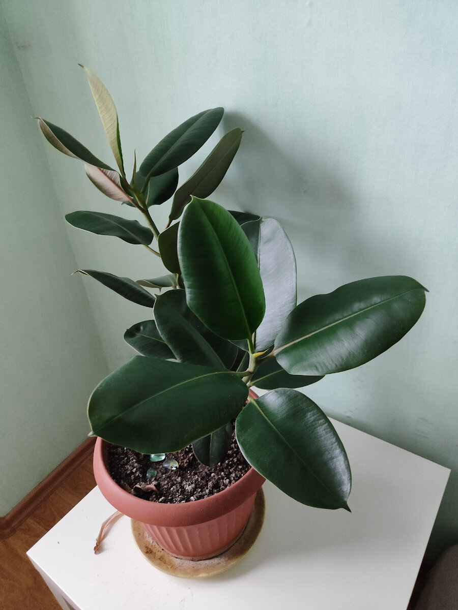 Я рассказывала, как размножается этот фикус одним листиком, но не каждый лист даёт корни и ещё реже пробуждается почка... Гораздо более простой и надёжный способ размножить каучуковое дерево, это отрезать одну веточку и посадить в землю. Нет особой разницы, поставить в воду для укоренения или сразу в землю, главное не дать молочку закупорить место среза на черенке. Этому деревцу примерно полтора года, я срезала веточку длиной около 20 сантиметров и поставила в воду. Дождалась появления корней и посадила в землю. Но потом мне нужно было перевозить растение и для удобной транспортировки я отрезала верхушку и оставила на укоренённой веточке только два листочка. Дерево быстро пошло в рост. На фото видно, что у него два ствола, это у каждого листа пробудилась почка. Его можно было обрезать снова и добиться формирования нескольких веток, но я решила оставить как есть. У меня дерево стоит в большом пятилитровом горшке, но почти половину горшка занимает дренаж. Такой же каучуконосный
