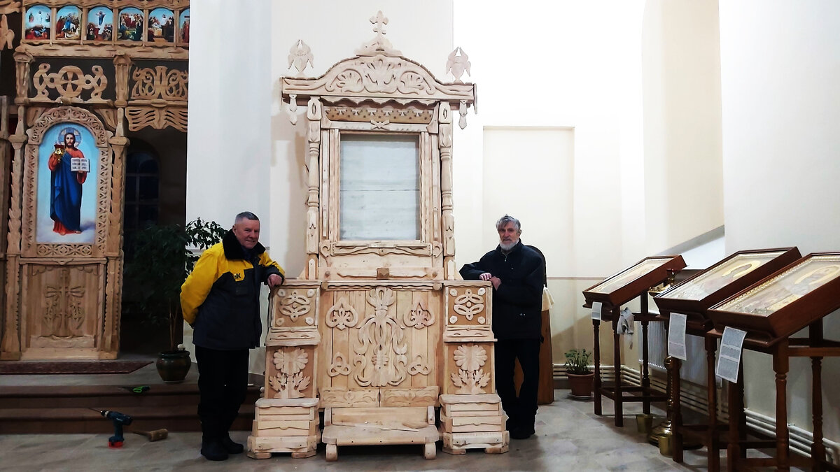 В понедельник, 27 ноября, рано утром приезжаю в город Домодедово в мастерскую нашего выдающегося резчика Федотова Михаила Николаевича. Спустя некоторое время из Тульской области сюда же приезжает машина. Цель нашей встречи загрузить в Подмосковье, изготовленный Михаилом Николаевичем большой напольный киот для иконы Рождество Христово, которые должны быть установлены в приделе Рождества Христова возродленного храма Рождества Христова села Мокрый Корь Ясногорского района Тульской области. Всё верно, здесь нет никакой опечатки и икона Рождество Христово, и придел Рождества Христова, и наш величественный храм освещён в честь Рождества Христова! Уже спустя несколько часов киот в разобранном виде доставлен в храм. В этом нам не помешали ни ледяные дожди, ни снег, ни сложная дорожная обстановка. И уже спустя пару часов я делаю на память и для истории фото собранного киота с теми, кто имел непосредственное участие в его изготовлении и сборке. Теперь резное убранство придела Рождества Христова