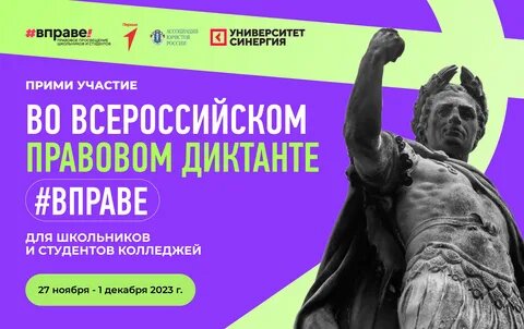 Сегодня мы разбирали онлайн диктант для предпринимателей. Вместе с ними пишут правовой диктант и школьники. Вчера стартовал Правовой диктант для учащихся 7-11 классов и студентов 1-4 курсов колледжей. Организаторы мероприятия - Российское движение детей и молодёжи «Движение первых», Ассоциация юристов России и Университет «Синергия».