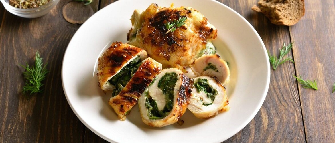 - На каждый ломтик грудки положите шпинат и немного тертого сыра, затем заверните в рулет.