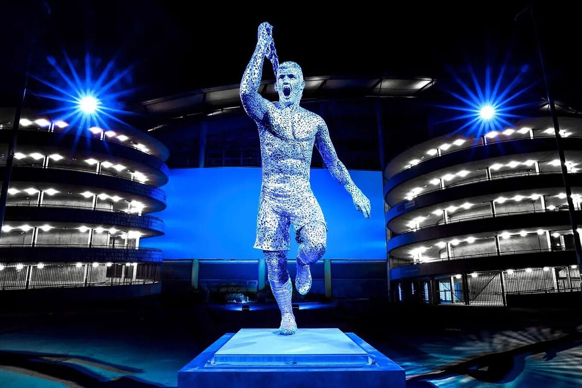 Еще три фигуры – уже из современной славной эпохи «Сити». Давид Сильва был первой новой звездой со своей статуей на «Этихаде». Там он провел десять ярких лет и удостоился статуи после ухода в 2020 году. Причем он единственный из игроков-статуй, который до сих пор карьеру не завершил. А вот Венсан Компани уже вовсю тренирует в Премьер-Лиге. Наверное, ему любопытно смотреть на свою статую, когда он с «Бернли» оказывается на «Этихаде». Бельгийца увековечили вместе с Сильвой в 2021 году. А через год открыли статую Серхио Агуэро – в честь десятой годовщины чемпионского гола аргентинца за «горожан». Он же принес «Сити» первый титул в АПЛ и открыл новую эру доминирования.
