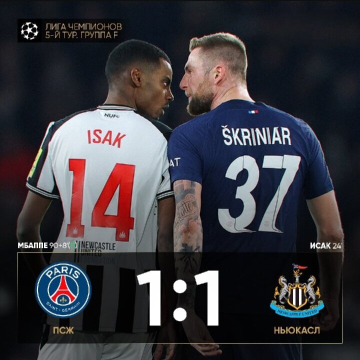 Во вторник, 28 ноября, состоялся матч 5-го тура группового этапа Лиги чемпионов сезона-2023/2024, в котором встречались французский «Пари Сен-Жермен» и британский «Ньюкасл Юнайтед». Игра проходила на стадионе «Парк де Пренс» в Париже (Франция). Игру обслуживала польская бригада арбитров, которую возглавлял Шимон Марциняк. Стартовый свисток прозвучал в 23:00 мск. Встреча завершилась вничью — 1:1. Первый гол в матче был забит на 25-й минуте первого тайма. Отличился шведский нападающий «Ньюкасл Юнайтед» Алекандер Исак. Этот гол стал первым для 24-летнего форварда в текущем розыгрыше турнира. «ПСЖ» смог сравнять счёт лишь на 90+8-й минуте. После этой игры в активе «Ньюкасла» стало пять очков. Англичане расположились на третьем месте в группе F. «ПСЖ» с семью очками идёт вторым