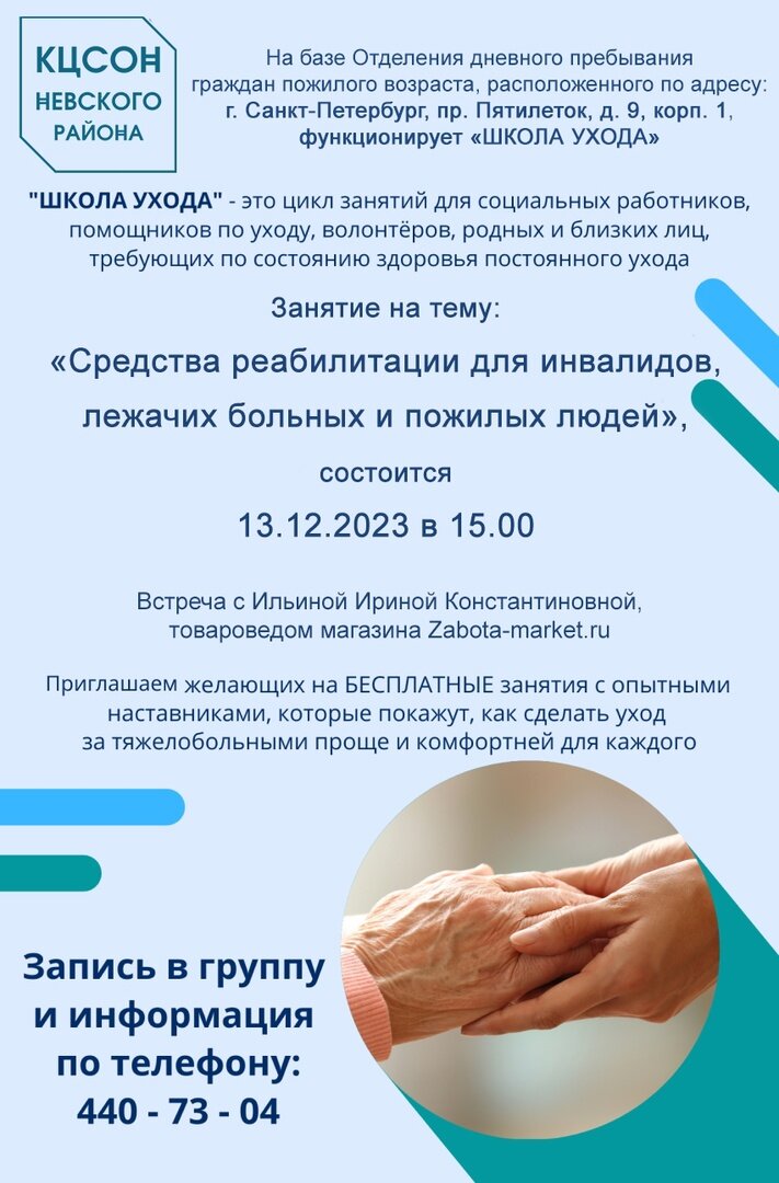 Приглашаем на занятие Школы ухода по теме "Средства реабилитации для инвалидов, лежачих больных и пожилых людей" 13 декабря 2023 г. в 15:00Адрес: пр. Пятилеток, д.9, корп.1#ШколаУхода #КЦСОННевскогорайона #НеСиделки #заботамаркет