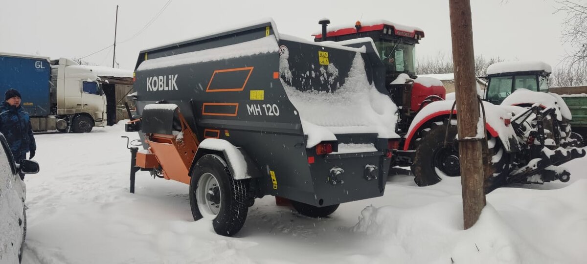 Во-вторых, это непосредственная раздача кормовых смесей крупному рогатому скоту. После загрузки бункера кормораздатчика имеющимися в наличии компонентами корма, агрегат транспортируется трактором в животноводческое помещение, открытое или закрытое. Механизатор опускает выгрузной транспортёр и подключает его привод, открывает заслонку и обеспечивает выдачу кормосмеси в кормушки по одной из сторон кормовой линии. А затем разворачивает агрегат и производит выдачу кормов по второй стороне кормовой линии. Когда раздача кормов происходит в местах без кормушек, «на кормовой стол», то возможно осуществление выгрузки на обе стороны одновременно. Крупная современная ферма – «рабочее место» кормораздатчика.