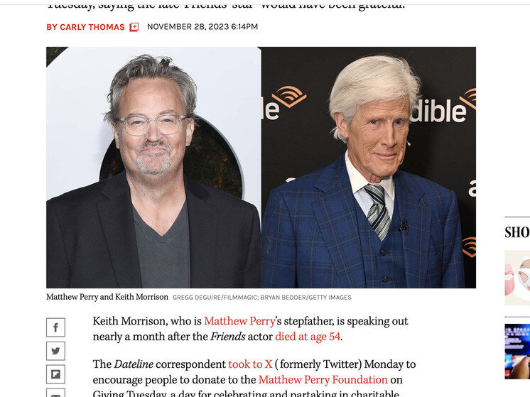 Отчим Мэттью Перри —Кейт Моррисон — в перый раз высказался почти через месяц после того, как его пасынок, актер сериала «Друзья», умер в возрасте 54 лет . Моррисон сделал пост в социальной сети в X (ранее Twitter) с призывом сделать пожертвования в Фонд Мэтью Перри в день празднования благотворительности им филантропии. «Это не то, чем я обычно занимаюсь,. Но в этом году все по-другому. А завтра Щедрый вторник. Делать то, что вы можете; он был бы благодарен», — гласит пост отчима. Фонд был основан после смерти Перри, чтобы продолжить его стремление помогать другим, борющимся с зависимостью. Актер публично рассказал о своей многолетней борьбе с зависимостью от алкоголя и опиоидов, в том числе поделился подробностями своей борьбы в своих мемуара , которые были выпущены в прошлом году. Перри умер 28 октября. Полицейское нашли его без сознания в гидромассажной ванне в его доме в Лос-Анджелесе. Причина его смерти все еще расследуется, ожидаются результаты токсикологического исследован