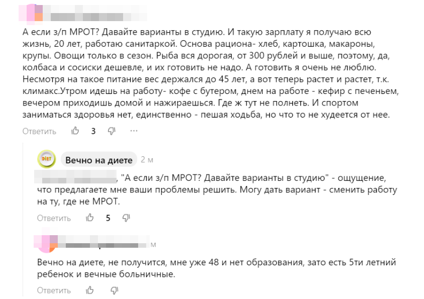 Если верить гуглу, МРОТ сейчас составляет 14000 рублей. Это минимальная оплата труда в России. По мне, тем, кто живет на эти деньги, не о похудении, а о выживании думать нужно.