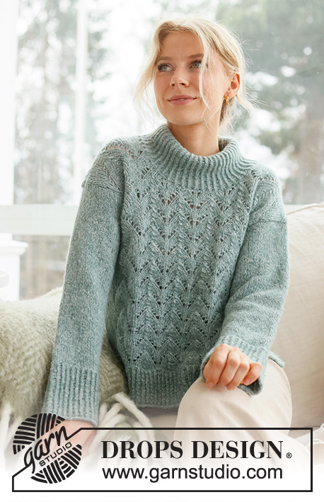 Свитер из пряжи DROPS Air вяжется снизу вверх ажурным узором, с разрезами по бокам и высоким воротником. Размеры S - XXXL.