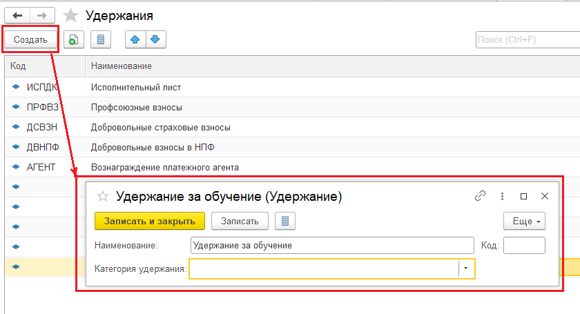 Но мы можем в разделе Зарплата и кадры — Справочники и настройки — Настройки зарплаты — Расчет зарплаты — Удержания — создать новое удержание: