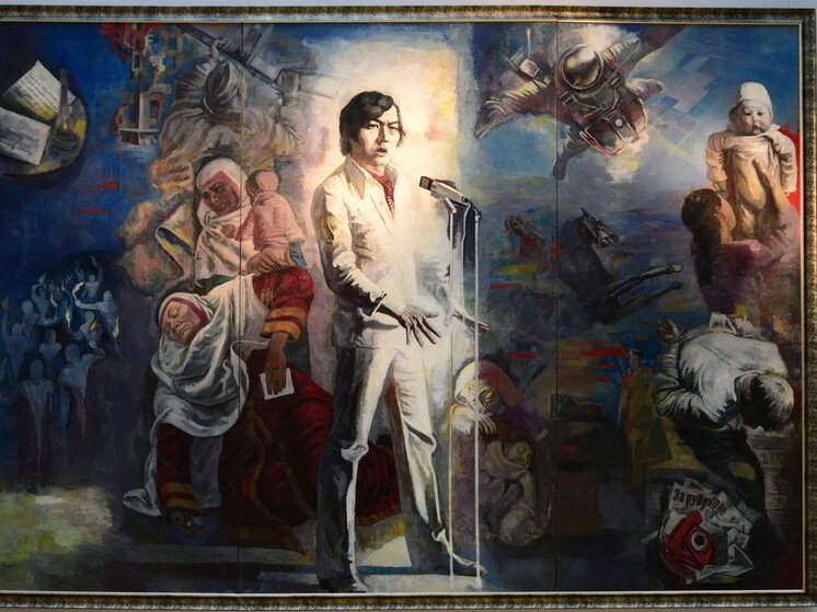 Амандос Аканаев — сама Вселенная, сам код своей страны. Иногда он пишет свое имя как АА. Разве это и не Алма-Ата? А может быть, и что-то еще. Этот код можно попытаться расшифровать, если пройтись по экспозиции его новой выставки. Она посвящена 75-летию юбиляра.