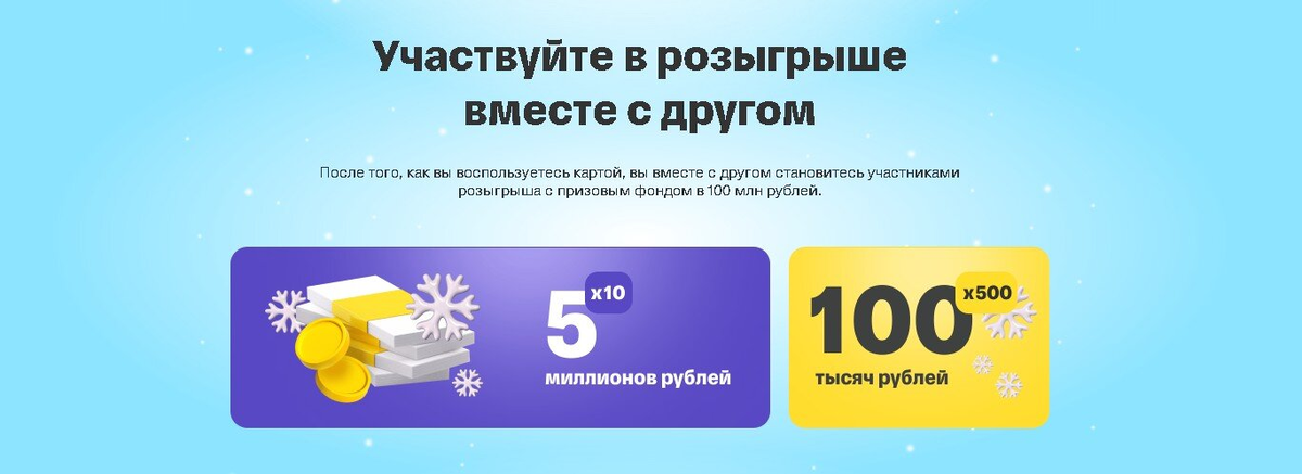 Подробнее о розыгрыше на сайте банка 👉перейти👈 Как принять участие в розыгрыше 100 миллионов рублей от Тинькофф? Если вы уже являетесь клиентом банка, то вам в личном кабинете нужно найти программу лояльности и приглашать в банк своих знакомы, друзей и т.д. Но, а, если вы ещё не являетесь клиентом банка для вас всё гораздо проще. Вам просто необходимо оформить дебетовую карту с бесплатным обслуживанием по этой ссылке и сделать покупку от 300 рублей, после этого вы участвуете в розыгрыше 100 000 000 рублей. Оформляя карту по ссылке ниже, вы: