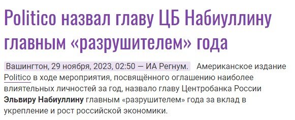 Но что подразумевается под "разрушителем" в их понимании? То, что глава ЦБ, получается, "разрушила" американские и европейские санкции, смогла им противостоять и укрепила российскую экономику. Причем данные успехи Набиуллиной там отметили не только за последние 2 года, а и за последнее десятилетие.