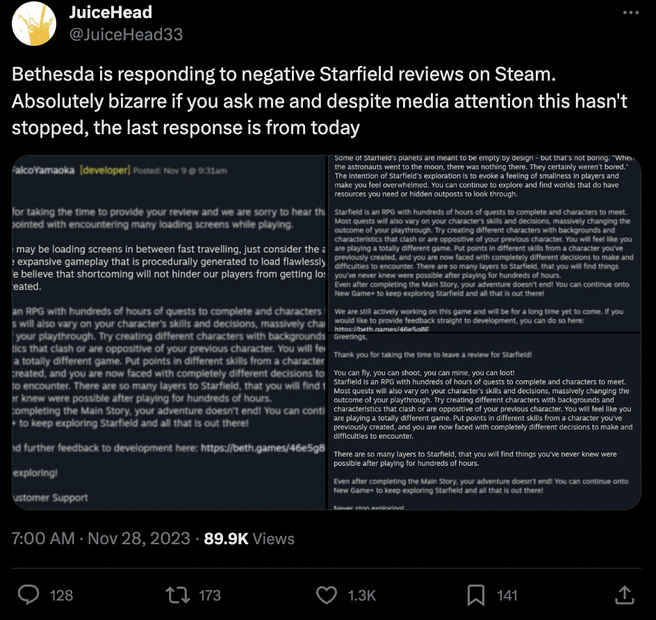 Команда поддержки Bethesda начала отвечать на негативные отзывы о Starfield в Steam. Starfield стартовала бодро, став "самым крупным запуском игры Bethesda" за всё время. Эти показатели продолжили расти в первые дни после релиза, и число одновременных игроков Starfield превзошло рекорд Skyrim (на время). Однако несмотря на начальные реакции игроков, сейчас у Starfield "смешанные" отзывы в Steam. На момент написания 69 процентов из боле чем 80 тысяч обзоров по игре на платформе были положительными. Оставшиеся, очевидно, менее благосклонны. Как отметил JuiceHead в социальных сетях, команда предприняла несколько необычный шаг, объясняя людям, оставляющим эти негативные отзывы, что игра на самом деле хороша. Затем они попросили их учитывать объем работы, который был вложен в создание игры такого масштаба. В ответ на комментарий пользователя, который назвал сюжет Starfield "банальным", а игровой процесс "скучным", один из сотрудников службы поддержки Bethesda ответил сообщением, в котором в