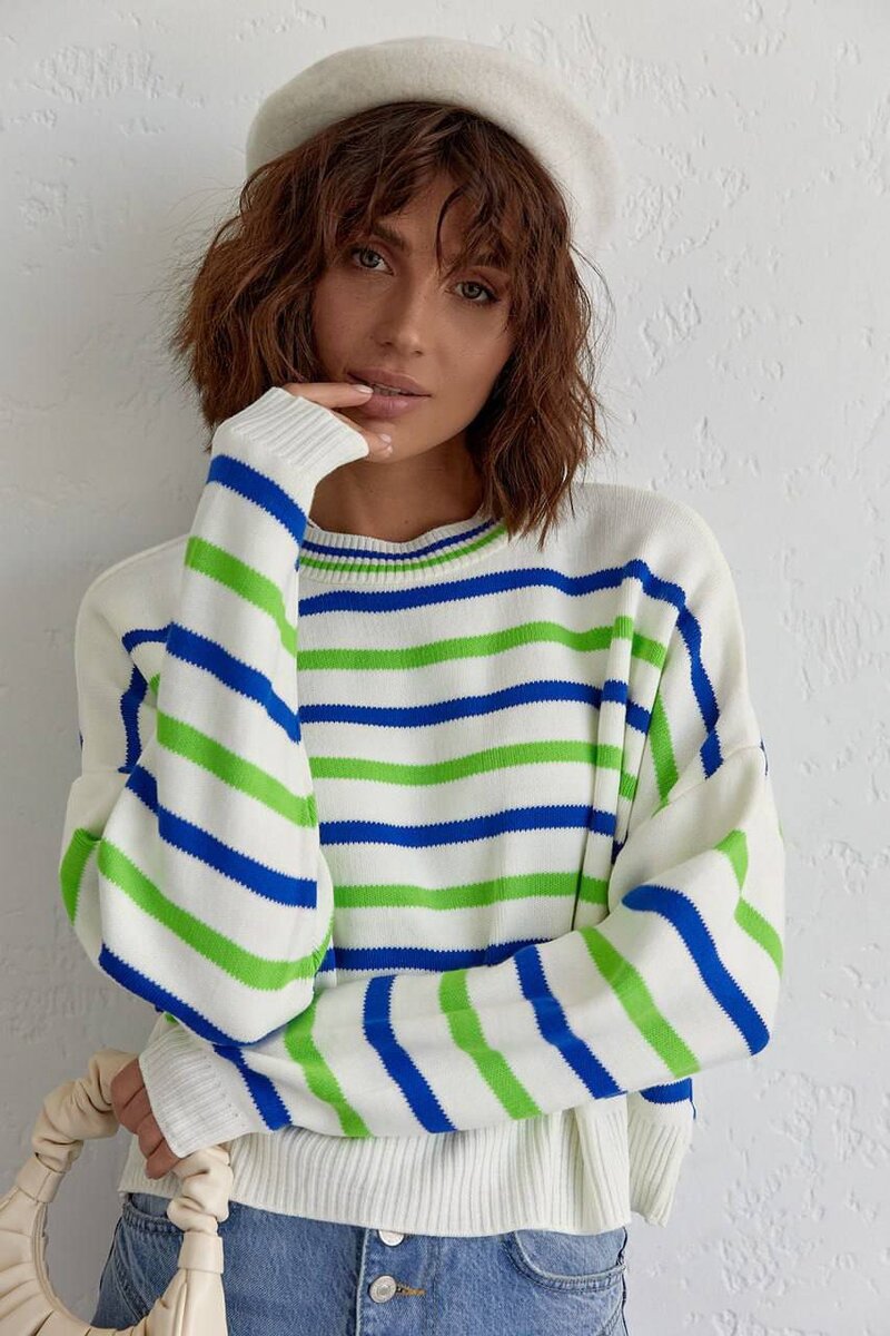 Джемпер доступен в ярком цвете: белый с тонкими цветными полосками, чёрный с тонкими цветными полосками