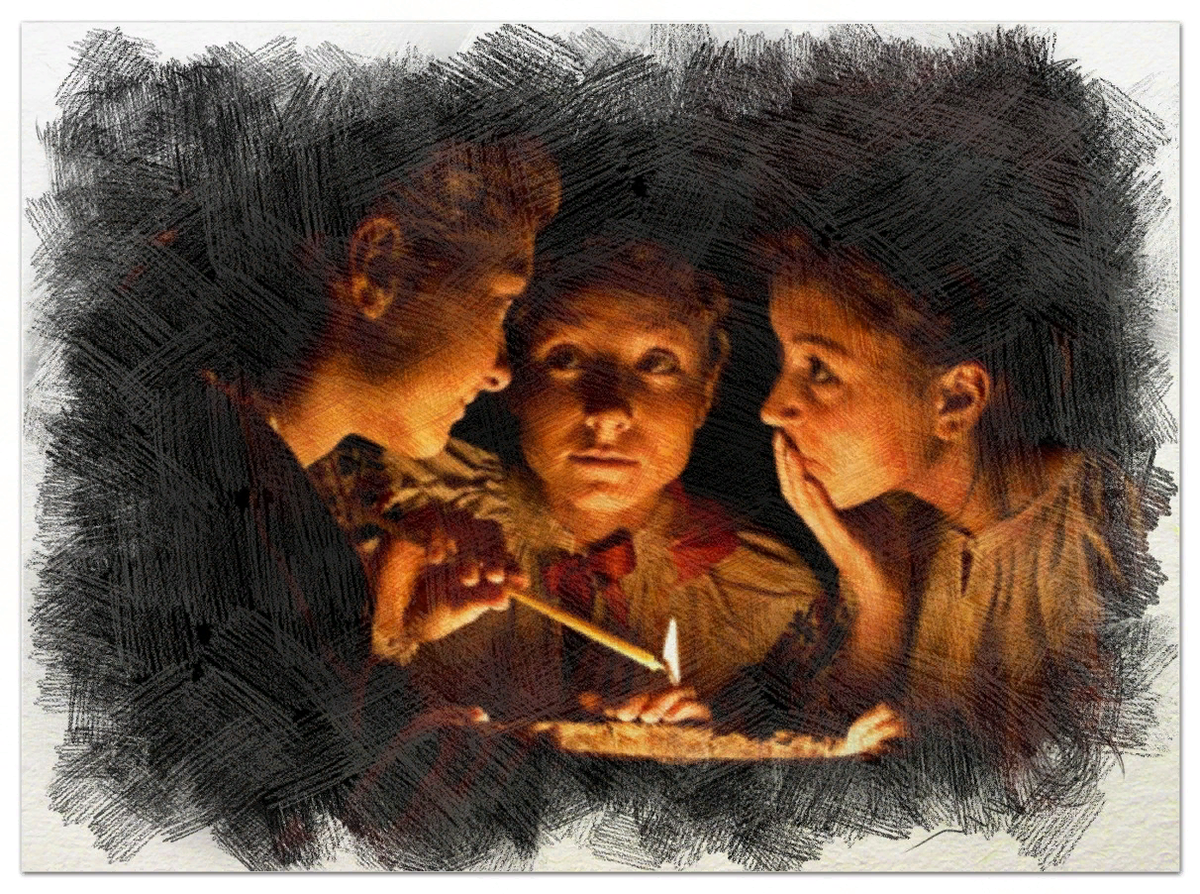 Вдруг, свечи начали трепетать, и холодный туман окружил их кольцом. Напряжение и страх повисли в воздухе. Девочки испуганно переглядываются. Только глаза Оли горят азартом и жаждой приключений.