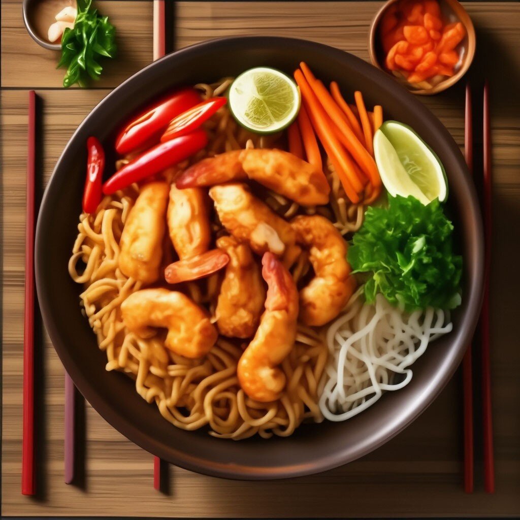"Тайская лапша" - это блюдо из тайской кухни, которое завоевало популярность по всему миру благодаря своему экзотическому вкусу и простоте приготовления. Это блюдо сочетает в себе изысканные ароматы и набор разнообразных ингредиентов, которые делают его настоящей вкусняшкой. Ингредиенты: - 200 г рисовых лапшей - 2 столовые ложки растительного масла - 2 зубчика чеснока, измельченные - 1 луковица, нарезанная полукольцами - 1 морковь, нарезанная соломкой - 1 красный перец чили, измельченный (если вы любите остроту) - 150 г куриного филе, нарезанного небольшими кусочками - 100 г креветок, очищенных от панциря - 100 г твердого тофу, нарезанного кубиками - 2 столовые ложки соевого соуса - 1 столовая ложка рыбного соуса - 1 столовая ложка тамариндового соуса - 1 столовая ложка коричневого сахара - Свежая кинза и лайм для украшения Итак, приступим к приготовлению блюда. Следуйте этим шагам: Шаг 1: Подготовьте рисовые лапши согласно инструкции на упаковке. Обычно для этого требуется залить л