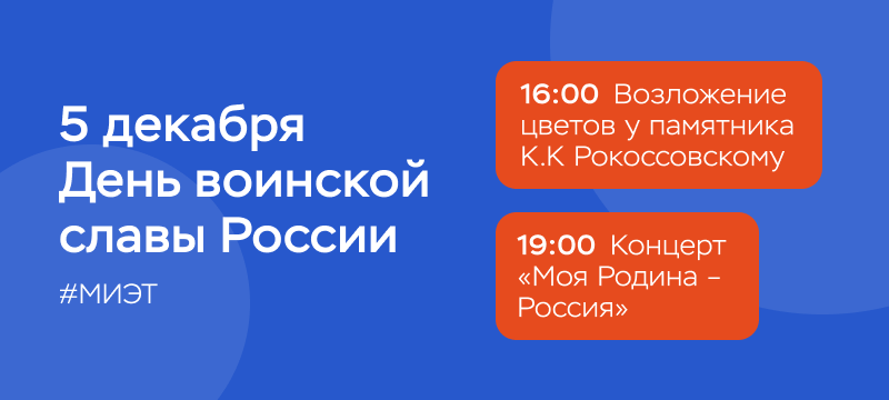 В 16:00 в Парке победы у памятника К.К Рокоссовскому состоится традиционное возложение цветов. В 19:00 в ДК МИЭТ студенческий патриотический клуб «Я горжусь» проведет тематический концерт «Битва под Москвой». Зрителей ждут выступления от студенческого академического хора МИЭТ, музыкального клуба «Диод», стихи от студентов МИЭТ и интерактив от клуба IMPROVMIET. Вход свободный.