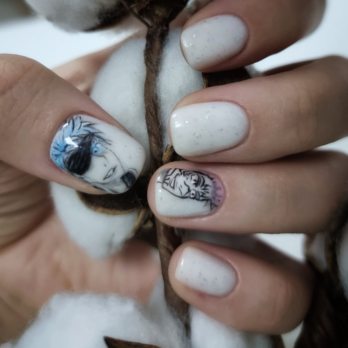 Теперь поговорим немного о Сатору Годзё(один из главных героев). Сатору Годзё - один из главных персонажей Jujutsu Kaisen. Сатору - гордость семьи Годжо, первый человек, унаследовавший способности: Бесконечность и Шесть Глаз за четыреста лет. Он работает преподавателем в Токийской школе магии и использует свое влияние для защиты и обучения сильных молодых союзников. Немного этапа прорисовки персонажа :3 Прорисовываю я, как обычно, силуэт черным гель-лаком. Добавила нос и очертание уха. После прорисовки рта на предыдущем фото, добавила повязку. Остаётся дело за малым. Дорисовала волосы, глаз, чуть точнее прорисовала ухо. Немного раскрасила. Всё запечатала топом для покрытия. Благодарю за прочтение статьи, буду рада вашей поддержки в виде подписки и лайка. :3