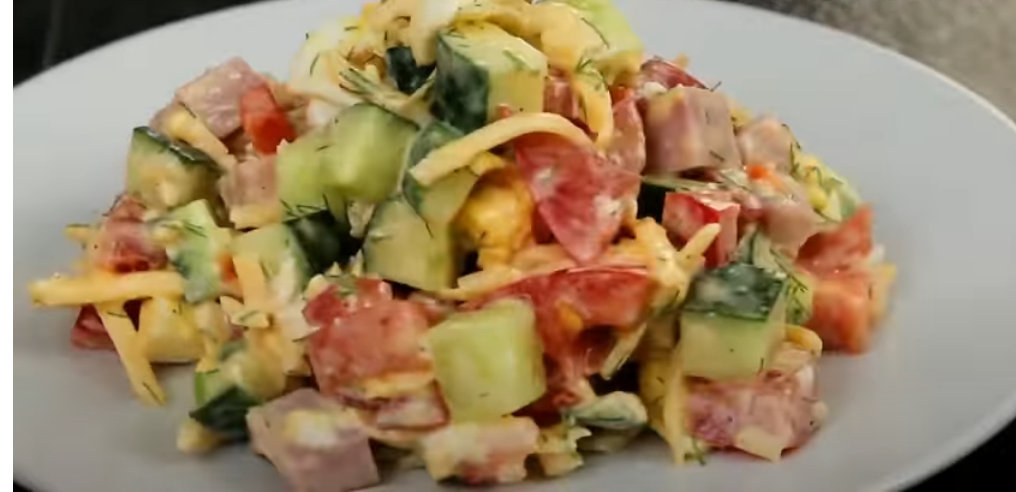 Друзья мои, салат, который я вам сейчас предложу, делать очень легко, все продукты доступны. Салатик получается свежий, легкий и вкуснейший. Каждый день его делать незачем, но вот в выходные, или на праздничный стол он вполне подойдет. Попробуйте, я думаю, равнодушных не останется! Ингредиенты: 1) Огурцы свежие, порезанные кубиком - 3 шт. средних 2) Перец сладкий, порезанный кубиком - 1 шт. 3) Сыр твердый, тертый на крупной терке - 150 г 4) Ветчина, порезанная кубиком - 200 г 5) Яйцо куриное, сваренное в крутую и порезанное кубиком - 3 шт. 6) Помидоры свежие, порезанные кубиком - 3 шт. средних 7) Зелень укропа, порезанная мелко - 20 г 8) Соль - по вкусу 9) Майонез для заправки - 3 столовых ложки Приготовление: Все ингредиенты перемешать, посолить и заправить майонезом. Все, наш вкусный и необычный легкий салатик готов! Его составляющие прекрасно сочетаются и дополняют друг друга, сыр и ветчина дают салату сытность. При желании вы можете использовать вместо ветчины мясо курицы, а майон