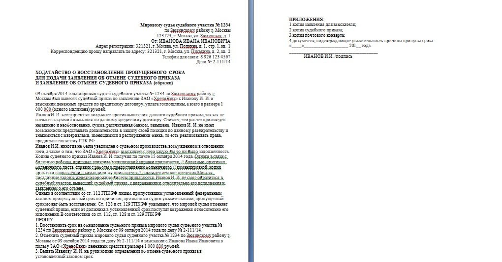 2. МФО подаст заявление на судебный приказ. Такой судебный акт выносится заочно, без участия сторон, поэтому должники чаще всего узнают о нем от пристава. Но могут обжаловать его, и тогда кредитору придется подавать на полноценное исковое производство. Для этого необходимо написать заявление мировому судье, а точнее ЗАЯВЛЕНИЯ О ВОССТАНОВЛЕНИИ ПРОПУЩЕННОГО СРОКА ДЛЯ ПОДАЧИ ЗАЯВЛЕНИЯ ОБ ОТМЕНЕ СУДЕБНОГО ПРИКАЗА И ОБ ОТМЕНЕ СУДЕБНОГО ПРИКАЗА.