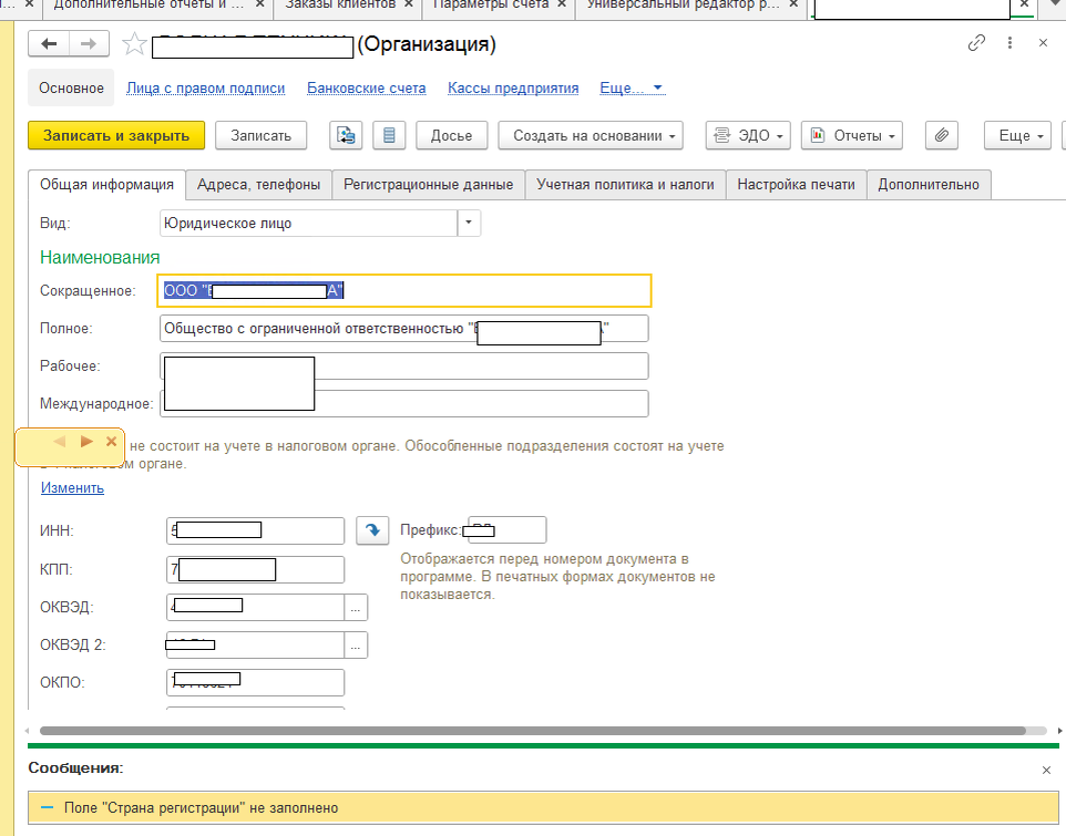 В случае если у вас после переноса данных при переходе на конфигурацию КА 2.5. из других конфигураций, из УПП как в моем случае, вам потребовалось что-то изменить в карточке организации и при записи карточки организации начинает появляться сообщение "Поле Страна регистрации не заполнено", при этом не давая ничего сохранить. Данная проблема связана с тем что в момент переноса данных по справочнику "Организация" не заполнили реквизит "СтранаРегистрации", который в пользовательском интерфейсе не виден. Для того чтобы исправить ситуацию необходимо при помощи универсальной обработки "Групповое изменение реквизитов" выбрать организацию у которой возникала ошибка при записи и заполнить реквизит "Страна регистрации" Доступным реквизит "Страна регистрации" в справочнике "Организация" становится, только при выводе служебных реквизитов После заполнения данного реквизита, ошибка "Поле Страна регистрации не заполнено" при записи организации должна уйти.