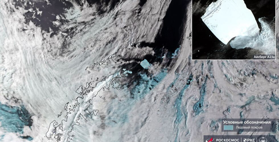 Посмотрите на крупнейший в мире айсберг, который скоро растает Российский спутник «Метеор-М» запечатлел самый крупный в мире айсберг А23а, который больше площади Петербурга в два раза. В ноябре его вынесло на воду в Южном океане, поэтому айсберг скоро прекратит свое существование. Снимок в среду, 29 ноября, опубликовал Роскосмос. «На спутниковом снимке российского гидрометеорологического КА «Метеор-М» — айсберг а23 в открытых водах Южного океана», — объяснили в ведомстве. Айсберг А23а откололся от шельфового ледника Фильхнера в сентябре 1986 года. Более 30 лет он находился на мели в центральной части моря Уэдделла, но весной 2023 года начал активный дрейф. Специалисты считают, что в ближайший месяц его вынесет в море Скоша, где он прекратит свое существование, но, возможно, айсберг останется в круговороте Уэдделла и будет дрейфовать — в этом случае его жизнь продлится еще на пару лет. Посмотрите фотографии крупнейшего айсберга в мире, опубликованные Центром ледовой и гидрометеорологиче