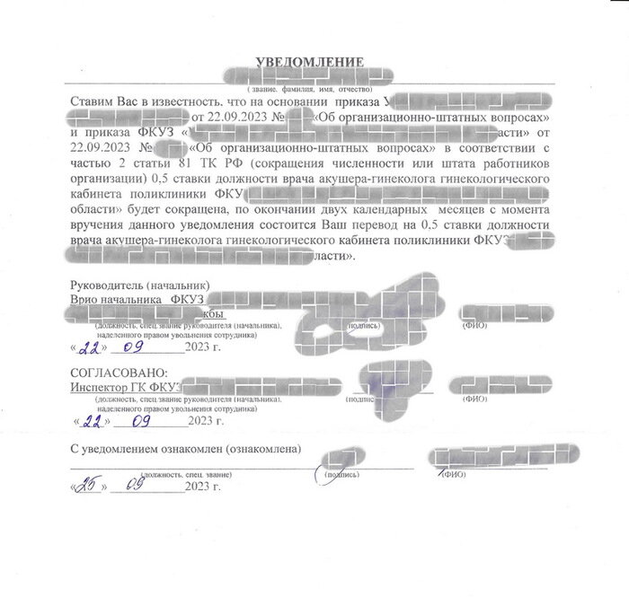 В общем, продолжаю серию про увольнение супруги. Краткое содержание предыдущих постов: Врача ведомственного мед. учреждения (немного конфликтующего с руководством) 2 месяца тому назад уведомили о грядущем "сокращении ставок". Долго ли, коротко, но добились мы ознакомления с приказами, на основании которых написано уведомление, однако приказы разочаровали: оказались сильно неинформативными. Далее супруге предложили остаться и продолжать работать на полшишки ставки, был написан отказ от такого щедрого предложения: В итоге, в день увольнения супруга получила вот такой вот приказ для ознакомления: Возникает большое кол-во вопросов. В частности, насколько грамотно была применена статья 77 ТК РФ (да и уведомление вообще-то было по ст. 81 ТК РФ)? Ну и в целом, терзают смутные сомнения о грамотности проведения данной оптимизации... На данный момент планируем обращаться в трудовую инспекцию, прокуратуру и суд с требованием отмены приказа и восстановления в должности. Хотелось бы услышать мнение