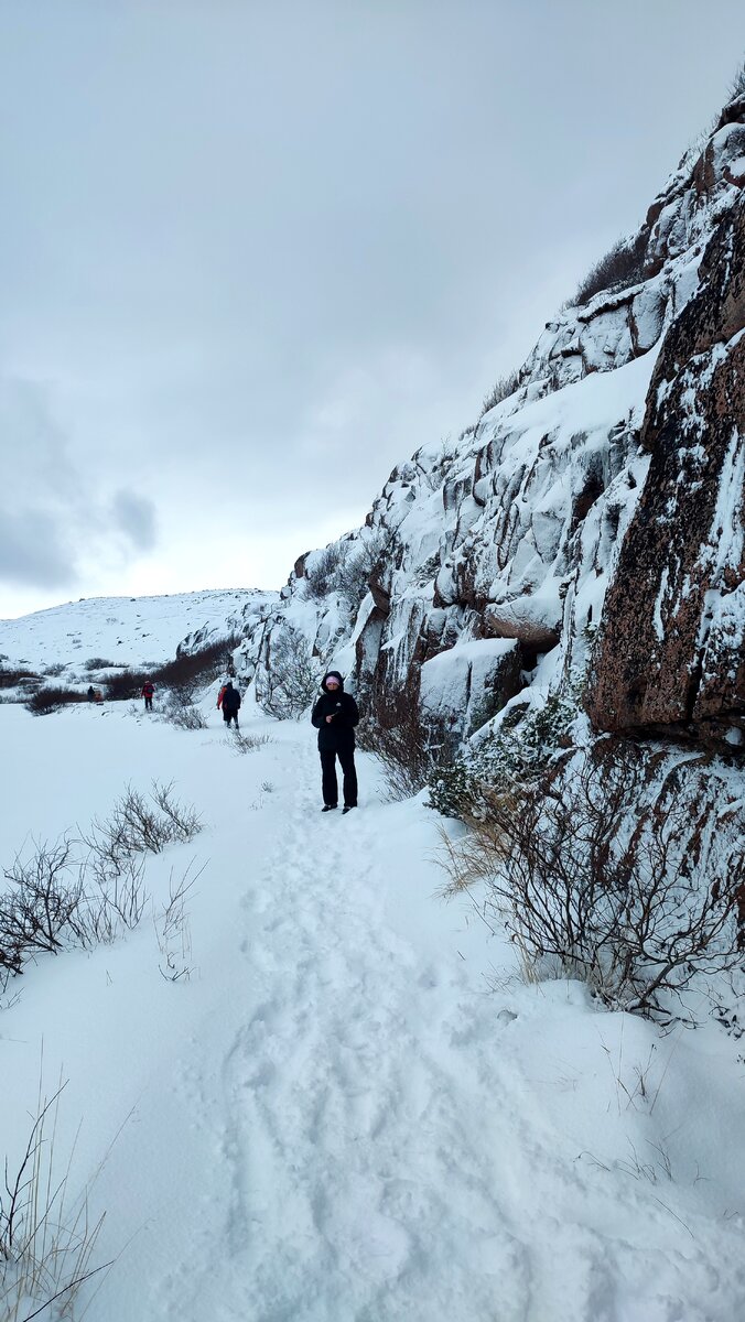 Вот такой подъёмчик, сначала камни, потом тропинка по снегу. Подниматься в гору было труднее, начал дуть ветер и опускаться туман🌪.