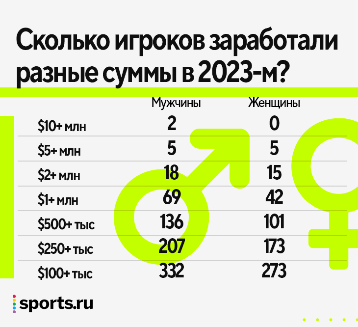 Теннисный сезон-2023 по факту завершился, так что самое время посчитать деньги – кто и сколько призовых заработал. Для начала немного абстрактной статистики, демонстрирующей разницу призовых в турах. Ига Швентек в этом году выиграла больше всех матчей, а по титулам выступила на уровне Карлоса Алькараса – но все равно заработала меньше денег. И вообще в женском туре в этом году никто не преодолел рубеж в 10 млн. Но куда больше борцов за женский теннис должно тревожить то, как сильно WTA уступает по количеству игроков, заработавших от 500 тысяч и меньше. Ведь это как раз и есть главная демонстрация силы организации – ее способность обеспечивать жизнь как можно большему количеству людей. В этом плане ATP явно справляется лучше. Если смотреть более детально, то топ-25 по призовым в этом году выглядит так. В топ-5 всего одна женщина, но в топ-10 гендеры разделились пополам. А в целом в топ-25 оказалось 15 мужчин и 10 женщин. Из занимательной статистики: ● Новак Джокович примерно 87% призовы