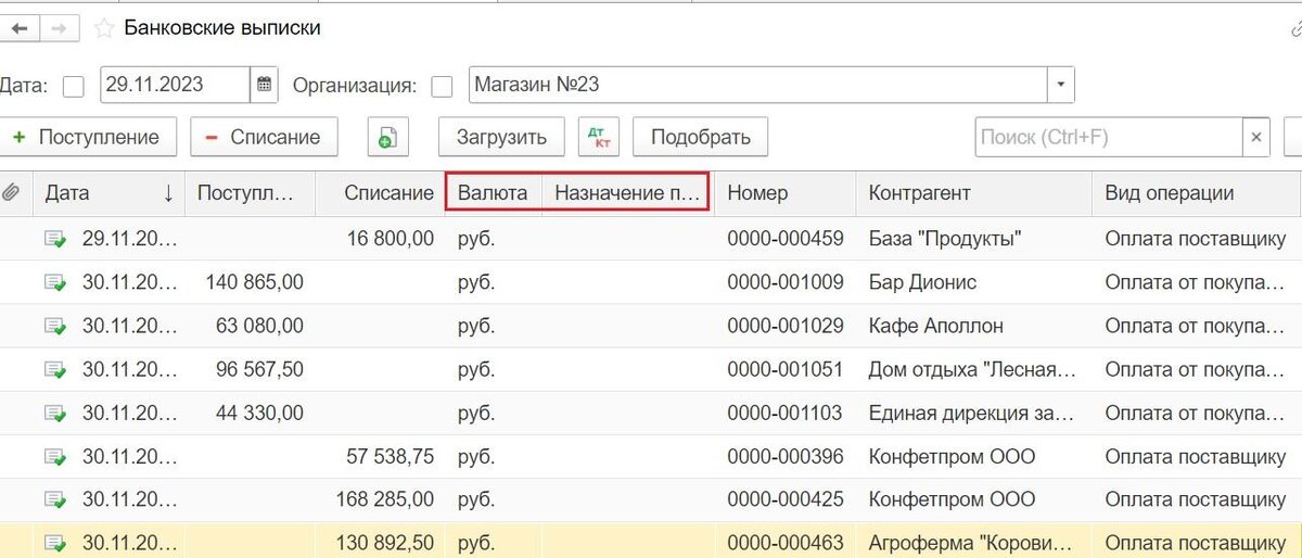 Как в программе 1С Бухгалтерия настроить список документов поступлений и списаний денежных средств с расчетного счета