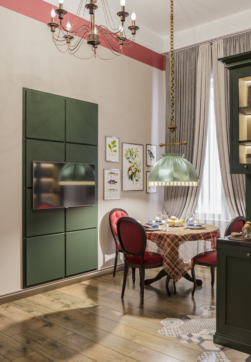 Кухня реализована в лиственно-зеленом цвете. С учётом нестандартной планировки, приняли решение поделить гарнитур на 3 зоны: шкаф для посуды, кулинарную и хранения продуктов. На противоположной стене разместили навесную панель того же оттенка зеленого, для телевизора, а рядом обеденный стол со стульями цвета красного бархата и старинной люстрой над ним. СПАЛЬНЯ