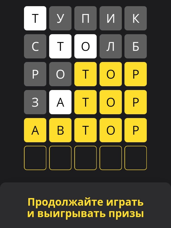 Не даю своему мозгу расслабиться. Очень приятно, что в приложении Тинькофф банка снова вернулась игра "5 БУКВ". Раз в день приходит оповещение. И я уже втянулась в эту игру, что не могу пропустить очередное слово и не поиграть. Играя, пытаюсь понять, как можно точно угадать слово. И поняла. Пять букв и шесть попыток. Угадать слово - ЛЕГКО👌. В призах, конечно, всякие разные скидки. Я ими не пользуюсь)) Мне просто нравится играть. Конечно, можно всякие другие приложения скачать и заниматься. Но это трата времени. Можно целый день в них просидеть, ничего другого не успев. А тут одно слово в день, и мозг позанимался. А когда удаётся слово угадать, порция гормонов счастья, называемая дофамин, тут же попадает в кровь. И так радостно становится на душе! А Вы играете в "5 БУКВ"?