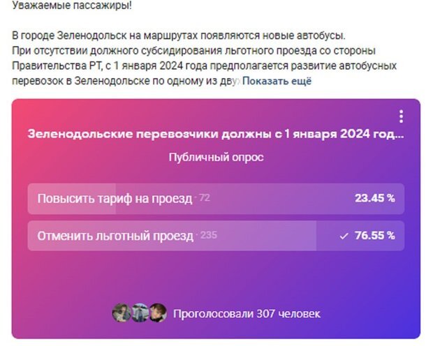 Информацию о возможной отмене льготного проезда, как осторожно назвали свой «ультиматум» сами перевозчики, Зеленодольское ПАТП разместило в соцсетях, объяснив эту меру финансовыми проблемами и проиллюстрировав на примере внутригородских маршрутов, где поездка обходится обычным пассажирам в 35 рублей: «18 рублей платит сам пассажир, покупая социальный проездной, 2 рубля компенсирует бюджет, 15 рублей покрываются перевозчиком из своего кармана… Из-за заниженного размера компенсации перевозки льготников в текущем году недополучено более 40 миллионов рублей, за последние 3 года — более 120 миллионов рублей». И провели опрос пассажиров, что им больше нравится — повысить тарифы на проезд или отменить льготы.