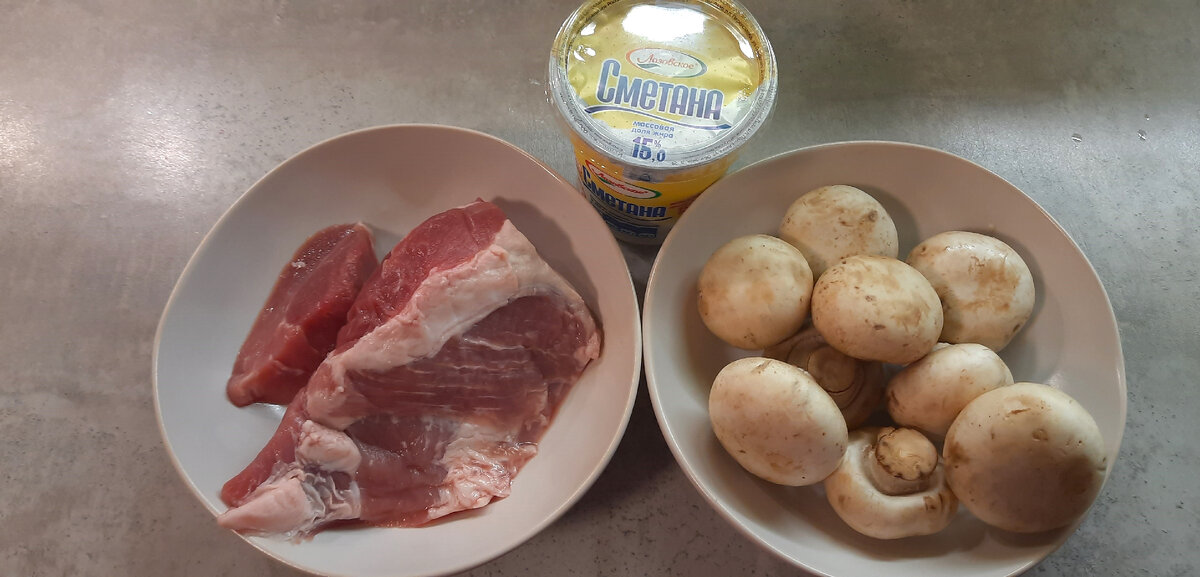 Соль и перец по вкусу. Приготовление: Свинину нарезала небольшими кубиками, шампиньоны помыла и нарезала на четвертинки. В сковороде на сильном огне разогрела растительное масло. Добавила свинину и помешивая обжарила пока не выпарилась жидкость у меня ушло на это 8 минут (в зависимости объема сковороды время может уйти больше или меньше) Добавила грибы, посолила и немного поперчила. Уменьшила огонь до среднего и помешивая жарила 10 минут, пока сок от грибов не выпарится. Уменьшила огонь до минимального добавила сметану, хорошо перемешала.
