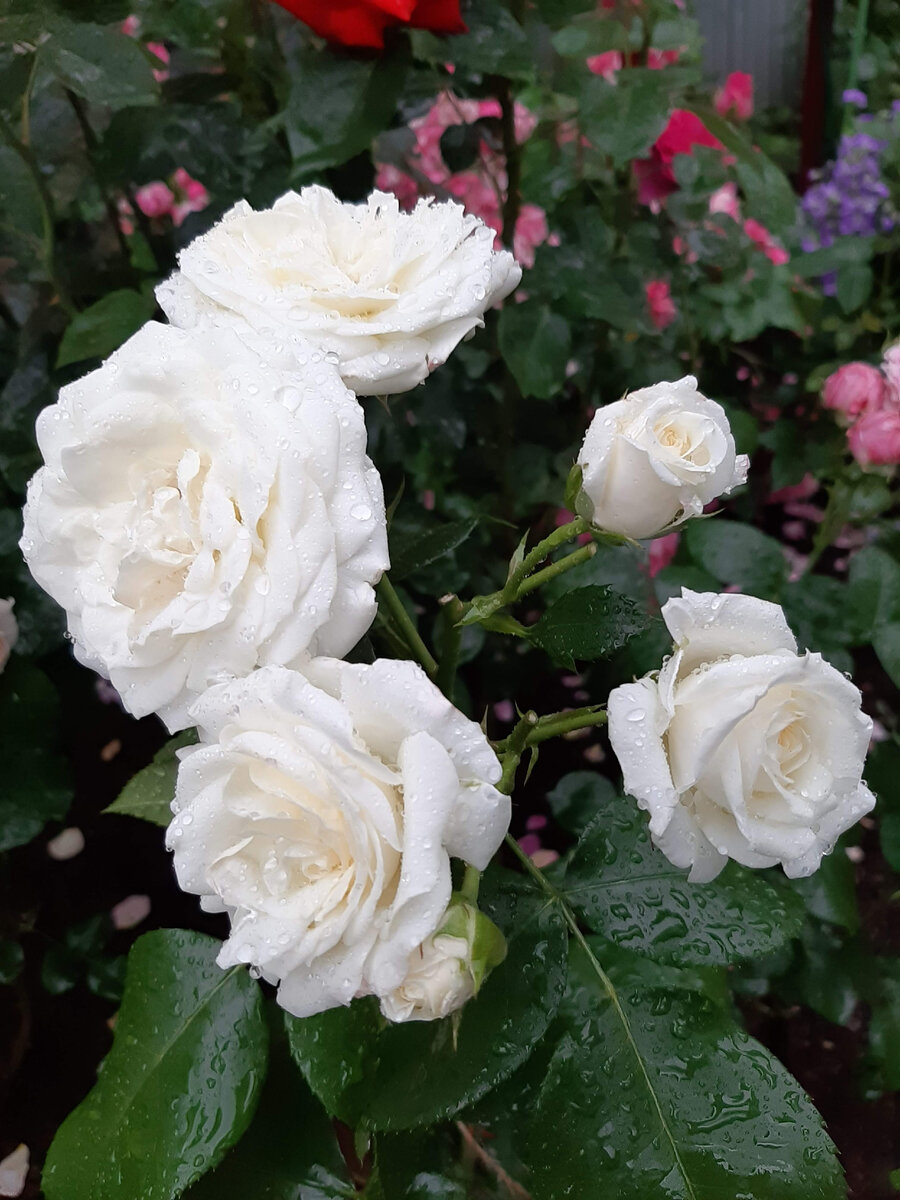 Для климата Подмосковья и таких же "мокрых регионов" - это чуть ли не основное качество. На первое место я бы поставила устойчивость к заболеваниям, на второе- к дождям, на третье - к жаре. Как ни странно, зимостойкость в расчёт не беру, в воздушно-сухом укрытии лично у меня все розы зимуют одинаково стабильно, независимо от того, на какую климатическую зону они рассчитаны. Исходя из этих достоинств выбираю розы с самым обильным и продолжительным цветением, которые при этом ещё и не горят на солнце, относительно долго держат цветок. Далее называю сорта из своего сада списком. 1. Флорибунда Alabaster/ Алабастер 2. Флорибунда Baronesse/ Баронесса 3. Флорибунда Botticelli/ Ботичелли 4. Флорибунда Briosa/Бриоза. Сорт новый, первый год в саду. 5. Флорибунда Geisha/ Гейша 6. Флорибунда Jazzz 7. Флорибунда Satchmo/ Сатчмо 8. Флорибунда Kimono/Кимоно 9. Флорибунда Cosmos/ Космос 10. Флорибунда Stephanie Baronin zu Guttenberg/Стефани Баронин цу Гуттенберг 11