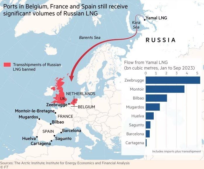 Порты Бельгии, Испании и Франции по-прежнему получают значительные объемы газа от сибирского завода «Ямал СПГ», крупнейшим акционером которого являются второй по величине производитель природного газа в России «Новатэк». Данные за 2023 год свидетельствуют о том, что разрешенные поставки российского газа обычно перекачиваются между танкерами в Бельгии, Франции и Испании. Хотя контракты на так называемую перевалку российского СПГ запрещены, перевалка обычно происходит между российскими танкерами «ледового класса», которые курсируют между полуостровом Ямал и северо-западной Европой, и обычными танкерами СПГ, которые затем отправляются в другие порты, освобождая суда ледового класса для возвращения на север. ➡️ Дело в том, что теоритически российский газ заменить можно, но на это потребуется много времени и денег. Нужно учесть, что газ из РФ это нажива. Работая в открытом море под "чёрным флагом" можно поднять денег. Потому санкции нарушаются и будут нарушаться, при этом наш газ будет