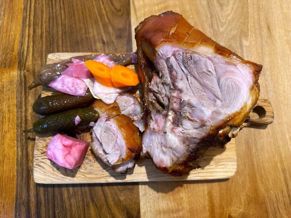 Рульку в пиве готовят в Германии и Чехии. Используется как светлое, так и темное пиво. Со светлым получается более деликатный вкус. Берем рульку, добавляем в нее соль перец, травы (у меня тимьян и розмарин) и заливаем пивом. Убираем ее в холодильник хотя бы на 3 часа. Я оставляю на ночь. Кладем рульку в кастрюлю или утятницу, заливаем пивом, в котором она мариновалась, добавляем лук (можно и другие овощи, такие как морковь, сельдерей) и варим на медленном огне 1,5-2 часа. Выкладываем рульку на лист, делаем надрезы на коже, так чтобы получилась сеточка. Обмазываем рульку смесью соевого соуса и мёда. Добавляем рассол, в котором она варилась и овощи. Плотно запечатываем рульку несколькими слоями фольги и ставим в, разогретую до 180 градусов, духовку. Готовим ее час. Убираем фольгу и снова обмазываем ее смесью соевого соуса и меда. Ставим рульку в духовку. Температуру можно поднять до 200 градусов, чтобы корочка подрумянилась. Переворачиваем рульку и обмазываем соусом. Повторяем эту процед
