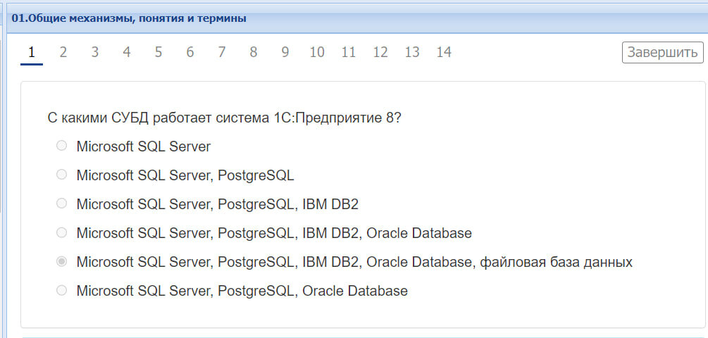 Вопросы ниже. Жирным шрифтом выбранный мною вариант ответа. По Итогу тест сдан на 100%. Все ответы верны. 1.С какими СУБД работает система 1С:Предприятие 8? 2. Пользователь может создать в справочнике группу 3. При заведении значения объекта конфигурации "Перечисление": 4. У объекта "Табличная часть" в качестве подчиненных объектов могут быть... 5. При обращении к неинициализированному параметру сеанса: 6. Какие объекты используются при описании алгоритма? 7. Сколько информационных баз может быть с одной и той же конфигурацией? 8. Если рабочие серверы кластера 1С:Предприятие работают с использованием разных операционных систем то: 9. Как можно разделить список пользователей на группы? 10. Определите отличие между вводом документа копированием и вводом "на основании" 11. Какое максимальное количество реквизитов документа позволяет определить система 1С:Предприятие 8? 12. Для нечеткого поиска данных (с одной ошибкой) в механизме полнотекстового поиска используется выражение: 13. Для ус