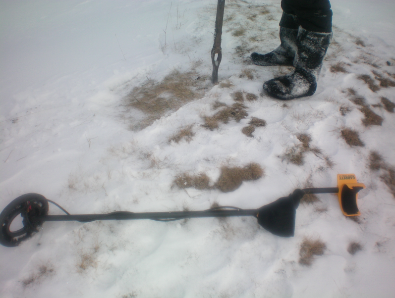Взяли мы металлоискатель и топор на железной трубе и отправились туда, где снега уже почти не было - на различные кочки и прочие искусственные возвышенности, созданные во время советского благоустройства территорий.