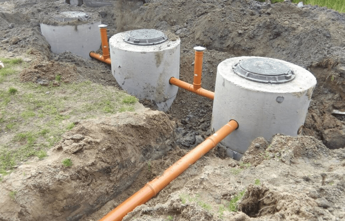 - Двухкамерные. Такой тип предполагает использование двух колодцев. В первую емкость из дома поступают стоки. После отстаивания твердые частицы оседают на дно, отстоявшаяся жидкость попадает по переливной трубе во второй отсек, а оттуда в грунт.