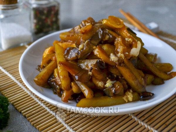 Готовим и сразу съедаем. Блюдо готовится из самых простых овощей, но с нотками китайской кухни. Получается ароматно, чуток пикантно и очень вкусно. Готовить можно даже в постные дни и подавать как самостоятельное блюдо либо как гарнир к мясу или рыбе (если не пост). Только овощи очень желательно съесть сразу после приготовления, так будет максимально вкусно😉 Чисанчи по-китайски В традиционном варианте этого блюда используется кунжутное масло, но подойдёт любое растительное масло для жарки😉 📝ПРИГОТОВЛЕНИЕ: 1. Очищенный картофель нарежьте брусочками и промокните бумажным полотенцем. Обжарьте на разогретой сковороде с маслом до полуготовности. Затем выложите картофель из сковороды, и подлив в сковороду масла, обжарьте нарезанный соломкой перец. Буквально 2-3 минуты. Затем выложите из сковороды перец и снова подлейте масла. Положите в сковороду нарезанные брусочками баклажаны и обжарьте их в течение 4-5 минут. Под конец обжаривания всыпьте сахар и перемешайте. 2. К обжаренным баклажанам