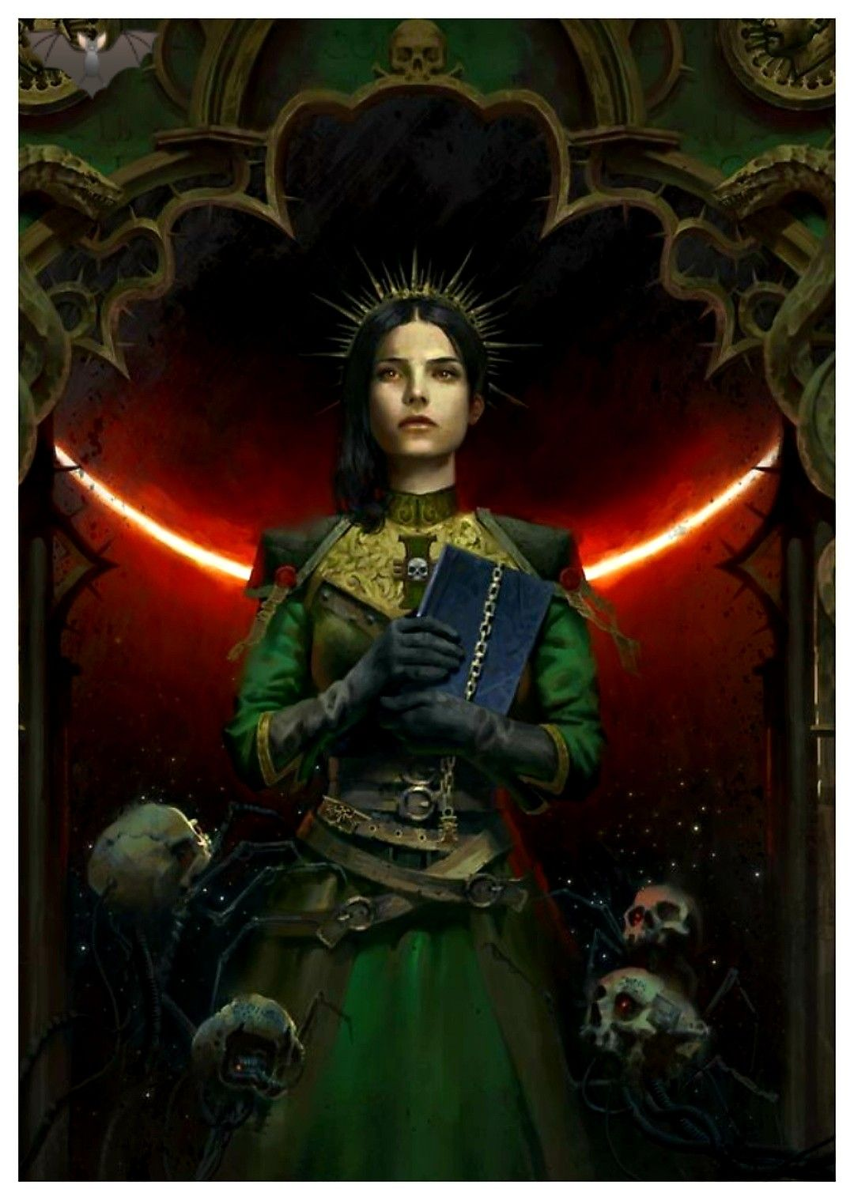 Теперь они отпрянули. Их мыслеформы на одно неосторожное мгновение начали имитировать реакции тел из плоти, находившихся так далеко и отпрыгнувших от удивления и тревоги. Несколько месяцев назад, в базилике святого Орфея, мыслеформа граэля Юдики была ранена проклятым клинком Скарпака, Несущего Слово. И тело из плоти и крови, принадлежащее Юдике позже проявило эту ужасную варп-рану. Явление симпатической психомагии — носитель страдал от отражения травмы, нанесенной проецируемой им мыслеформе. Здесь уже было наоборот — мыслеформы отражали телесные рефлексы носителей. Несмотря на огромную мощь, граэлям все–таки было чего бояться. Гости, как и предполагал Гидеон, оказались Адептус Астартес. Космодесантниками в полной боевой экипировке. Но, вопреки теории Гидеона, не все они оказались из предательского XV легиона. Один из них — самый высокий, воплотившийся в самом в самом сердце рядов граэлей — как сразу же стало ясно, был командиром. Доспех из сверкающего лазурита — такой насыщенный синий цвет тогда я увидела впервые. Броня отделана полированным золотом, наполовину скрыта одеянием, струившимся словно нефть. Золотой шлем украшало множество полос из лазурита — он напоминал формы головных уборов фараонов в древние времена. Высокий гребень шлема, белый, словно чистый лед прибавлял роста воину. Лицо — изваяние оскаленного золота с четкими прорезями для нахмуренных глаз и опущенного рта. Это, как я потом узнала, был Сенефуру, так же называемый Просперином. В одной руке он держал стержень из полированной меди длинной в два метра, увенчанный серебряным навершием в виде головы воющего кота. А другой размахивал богато украшенным хопешем — крючковатым серповидным мечом Нилус Дельта. Он отвел хопеш в сторону плавно и грациозно, настолько точно, что я бы никогда не подумала, что огромный бронированный сверхчеловек способен на такое. Взмах ловкого убийцы отсек голову граэлю, стоявшему справа. Кобальтовый граэль рухнул вниз и упал на одно колено. Ему нанесли урон, но не такой, как мы — это не временное разрушение мыслеформы, а просто убийство. Я услышала потрескивающий вокс-вой, полный боли — его издавал паук. Обрубок шеи источал энергию, текущую и разбрызгивающуюся по полу, словно вода. Жидкость напоминала ихор. Рядом с великолепным воином из Тысячи Сынов стоял еще один космодесантник самый массивный из шестерых. Каждая часть огромной матово-серой пластины, казалось, была вырезана из магматического магнетита. Края же оказались довольно простыми без отделки. Единственным украшением служили бесчисленные иероглифы, выгравированные на золотых листьях. Они светились на гладкой тусклой поверхности, словно разжигаемые внутренним пламенем. Он походил на зубра, огромной физической силой и самой позой с опущенными плечами и и задиристо поднятой головой. В огромных лапах он держал боевой цеп с длинной рукояткой и шипованным навершием на цепных петлях. Не было никаких сомнений в том, что он был одним из неукротимого IV Легиона, так называемых Железных Воинов. С тектоническим ревом он принялся размахивать огромным цепом, двумя руками, борясь с граэлями в пределах досягаемости. Попадания оружия рвали, разбивали вдребезги и раздавливали их цветные мыслеформы. Они деформировались, словно смятая плоть, извергая потоки ихора. Теперь уже заговори