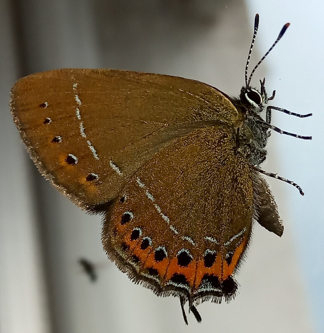 Перебирая старые снимки, наткнулся на сделанные в конце июня фото бабочки. Она ночью влетела в окно и сидела на стекле. Чтобы не пугать насекомое, я сделал фото и погасив свет, оставил открытым окно. На рассвете она улетела. Обычно я собираю снимки, раскладывая по альбомам, для того, чтобы однажды вынуть оттуда все изображения насекомого, птицы или растения. Но фото этой бабочки были счастливой случайностью. Она настолько редка, что встретить вторую такую "фотомодель" почти невозможно. Это один из красивейших видов бабочек Голубянок. Хвостатка Сливовая. На латыни в книжных справочниках она называется Strymon Pruni. Интернет же использует более молодую формулировку : Satyrium Pruni. Чтобы понять, почему эту Голубянку назвали Хвостаткой, достаточно посмотреть на снимок. Сливовой её обозначили за пристрастие гусеницы к кормовому растению. Хотя, расти гусеницы могут не только на Сливе. Развиваются они и на Черёмухе, Терне, Вязе. Ареал распространения Хвостатки охватывает весь умеренны