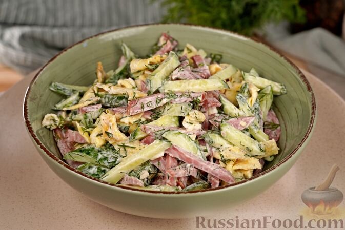 Салат с колбасой, огурцами и блинчиками. Картофельный салат с копчёной рыбой. Салат с морской капустой и мидиями. Салат с курицей, кукурузой и грибами. Салат из помидоров с оливками и орехами. Картофельный салат с копчёной рыбой, яйцами и свежими огурцами. Продукты великолепно гармонируют. Репчатый лук отлично их дополняет. Заправляется сытный салат оливковым маслом. Салат с морской капустой, мидиями, морковью по-корейски и зелёным горошком – отличная закуска из морепродуктов. Заправляется салат растительным маслом, а добавление молотого кориандра придаёт закуске аппетитный аромат. Слоёный салат с курицей, кукурузой и маринованными шампиньонами великолепно украсит любое застолье. Прекрасный вкус салата достигается благодаря гармоничному сочетанию простых продуктов. Салат с помидорами, луком, оливками и орехами готовится без майонеза, с заправкой из оливкового масла с лимонным соком. Лук придаёт салату лёгкую остроту, оливки – деликатную кислинку, а грецкие орехи делают салат более ори